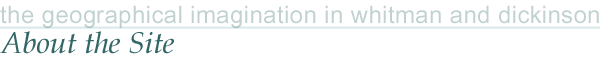 ![]() The Geographical Imagination In Whitman and Dickinson is a web teaching component of The Classroom Electric: Dickinson, Whitman and American Culture project sponsored by FIPSE. Server space was generously provided initially by the Humanities Division, University of California, Santa Cruz, and currently by the Institute for Advanced Technology in the Humanities at the University of Virginia. The site was designed by Kirsten Gruesz and Lara Vetter, and is maintained by Lara Vetter, with Lisa Antonille's assistance. Caveats: This is an experimental site under occasional construction. Images and text are used as set forth in the Fair Use Act; when necessary, copyright permissions are being secured. Nineteenth-century maps, unless otherwise credited, are used courtesy of The Maps Collection, University of California, Santa Cruz. Please email me at ksgruesz@cats.ucsc.edu with comments. Kirsten Silva GrueszDept. of Literature, University of California, Santa Cruz ![]() |