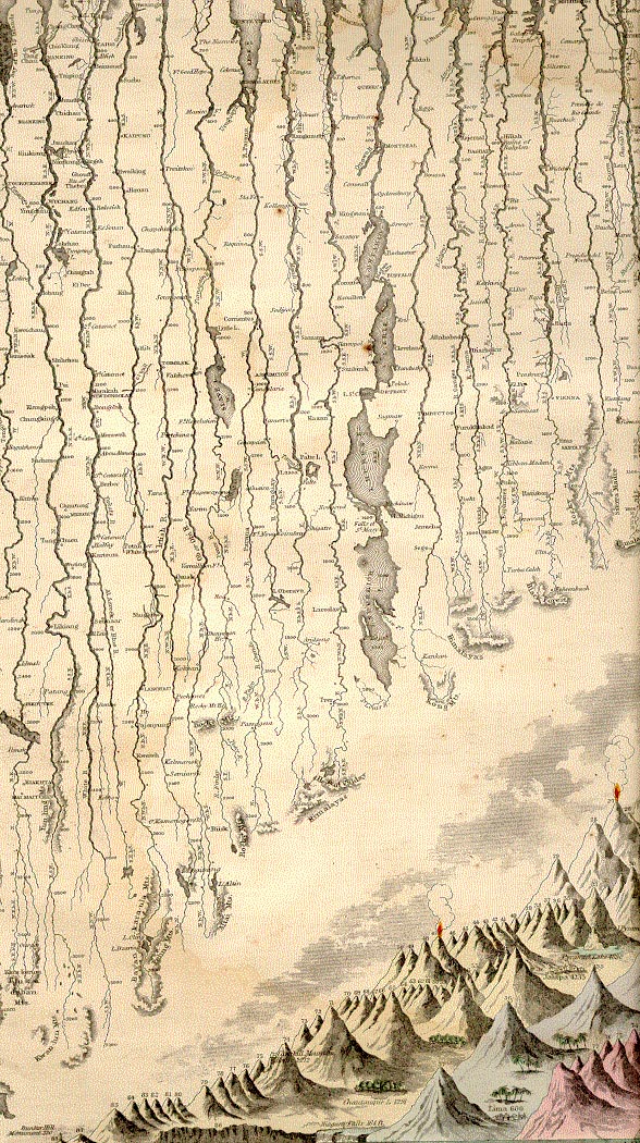 ![]() These images appear as a double-page spread at the beginning of G. Woolworth Colton, Colton's General Atlas (New York: G.W. & C.B. Colton, 1866). The graphics at the top represent the world's major rivers, arranged from longest to shortest; the graphics at the bottom represent the world's mountains and volcanoes (with tongues of flame), from lowest to highest. The two sets of graphics information form a diagonal shape, giving an attractive sense of proportion as they bring these difficult-to-comprehend numbers to life. Courtesy Maps Collection, University of California, Santa Cruz.